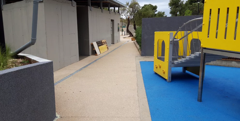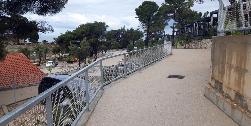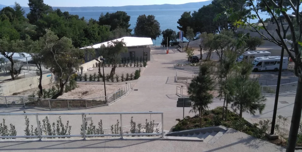 Za uređenje okoliša kampa korišten je CEMEX CoolirBASIC dekorativni beton, koji se izvodi razastiranjem i ravnanjem betona specijalne recepture. Nakon površinske obrade, uklanja se sloj cementne paste, otkrivajući zrna kamenog agregata koja čine protukliznu i čvrstu površinu. Ovaj beton je idealan za pješačke zone, šetnice, nogostupe i druge vanjske prostore zbog svoje trajnosti i privlačnog estetskog izgleda.