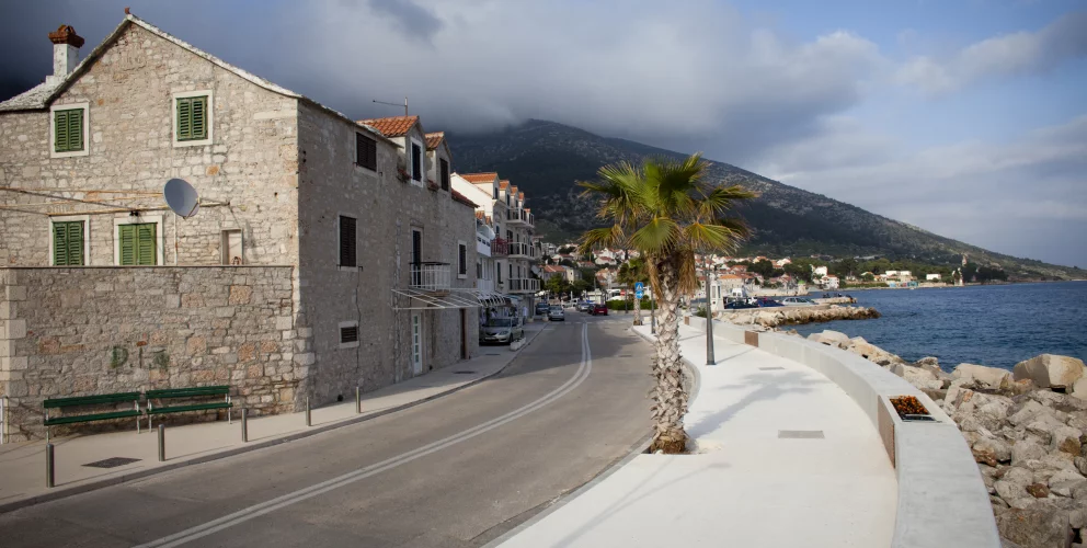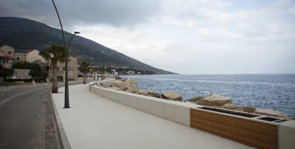 Za uređenje šetnice korišten je CEMEX CoolirCUSTOM dekorativni beton s obradom površine štokovanjem. Ovaj beton osigurava visoku otpornost na vanjske utjecaje, a njegova površinska obrada pruža prirodan, elegantan izgled koji se harmonično uklapa u okoliš.