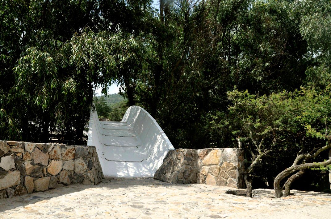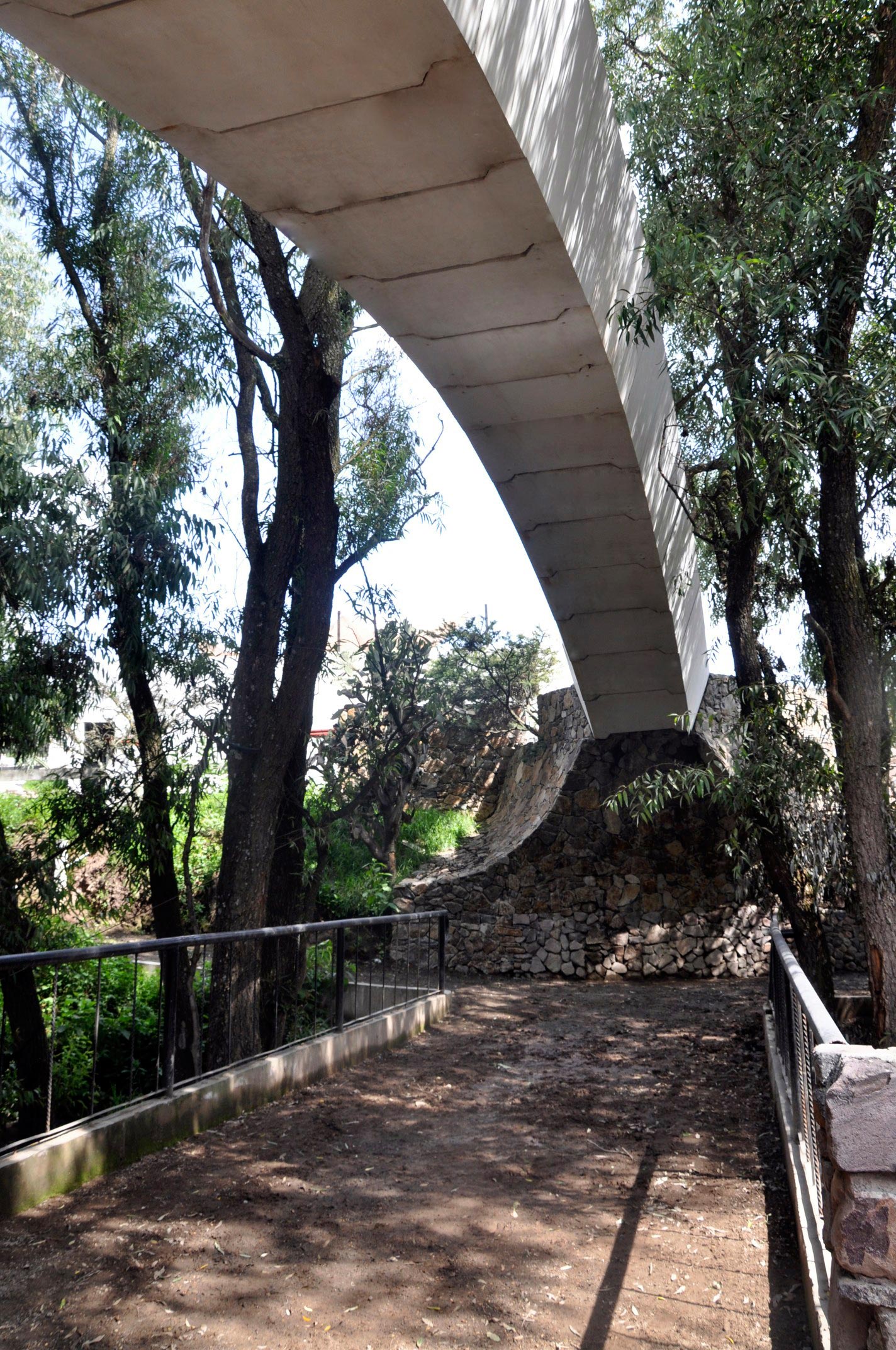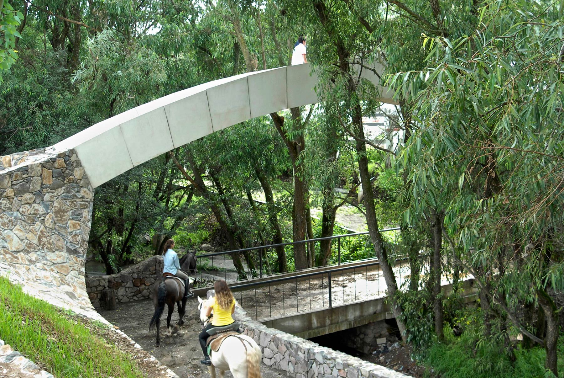 Si bien se retomó una solución milenaria, como lo es un arco de medio punto, sí hubo un cambio en la forma de ejecutar las dovelas, cuenta Barona Coghlan. “En vez de labrar piedra, lo que hicimos fue elementos prefabricados en concreto, y concreto blanco para que pudiera perdurar en el tiempo y tuviera una armonía más interesante con el entorno”, dice. Ya que el sitio en cuestión se encuentra cubierto de eucaliptos y en medio del cauce de un río, prefabricar los elementos fuera del sitio les permitió cumplir con ser amigables con el ambiente.